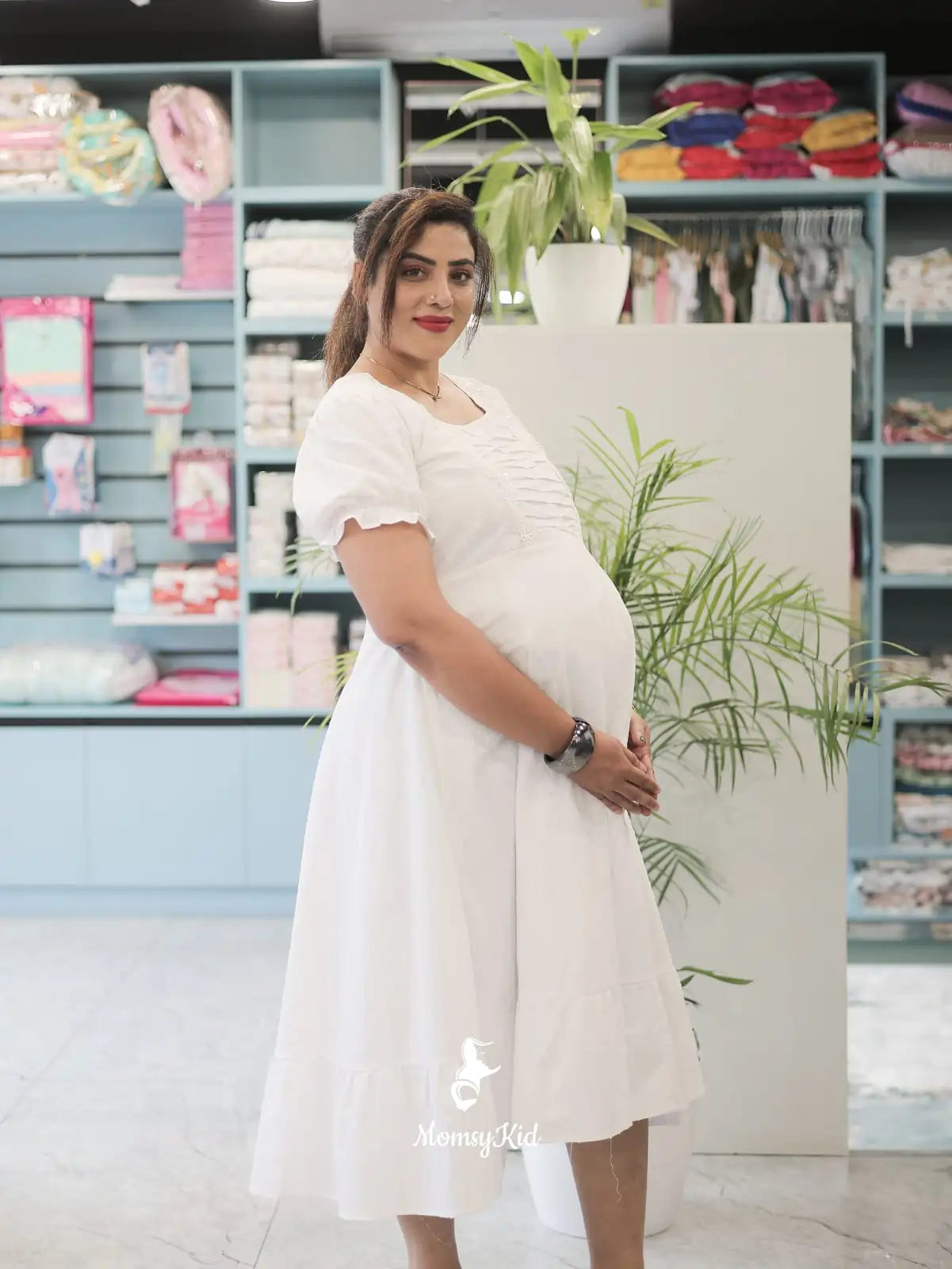 White Butta Cotton Midi Length Maternity Dress With Ruffled Puff | Feeding Friendly Dress | Soft Cotton Fabric | Comfortable Pregnancy Outfit | MK-MW-1057